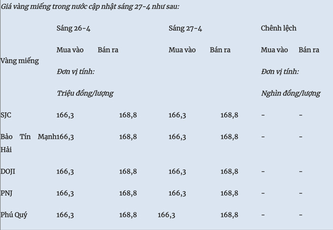 Các thương hiệu SJC, Bảo Tín Mạnh Hải, DOJI, PNJ, Phú Quý đều giữ nguyên giá so với sáng hôm qua, giao dịch vàng miếng ở mức 166,3 – 168,8 triệu đồng/lượng (mua vào - bán ra).