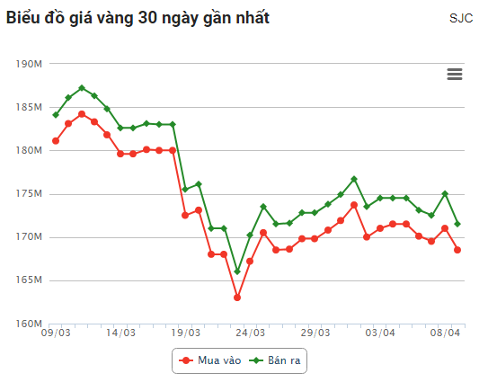 Giá vàng nhẫn 9999 cũng giảm mạnh về mức 171 triệu đồng/lượng, mua vào 168 triệu đồng/lượng.