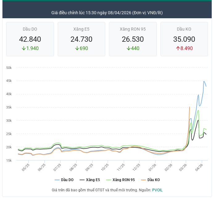 Chiều ngày 9/4, liên Bộ Công Thương, Bộ Tài chính quyết định điều chỉnh giá bán lẻ xăng dầu, áp dụng từ 15h30 cùng ngày.