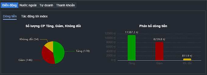 Thống kê cho thấy số mã tăng (178 mã) vượt trội so với số mã giảm (146 mã), phản ánh trạng thái “đỏ vỏ xanh lòng” điển hình. Dù chỉ số giảm điểm, phần lớn cổ phiếu trên thị trường vẫn giữ được sắc xanh hoặc dao động tích cực.