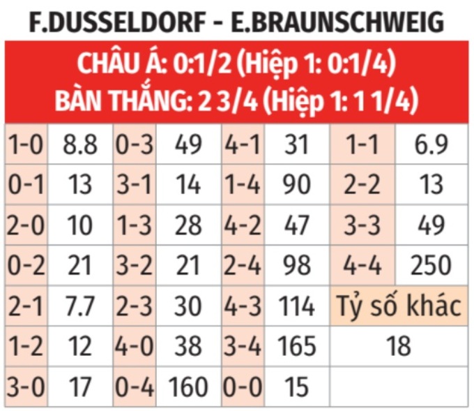 - Tối đa 1 bàn hiệp 1: 5 trận đấu gần đây của Dusseldorf đều chỉ có tối đa 1 bàn thắng trong hiệp đầu. Tình trạng tương tự xảy ra ở 5/6 trận đấu vừa qua của Braunschewig.