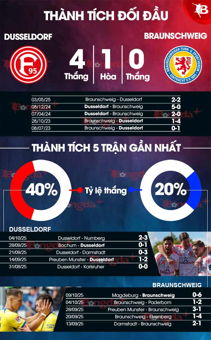 Thêm một lý do để ủng hộ đội chủ nhà ở trận này là thống kê đối đầu. Theo đó, Dusseldorf bất bại trong 10 lần đụng độ Braunschweig gần đây. Trong đó, họ giành 5 chiến thắng.