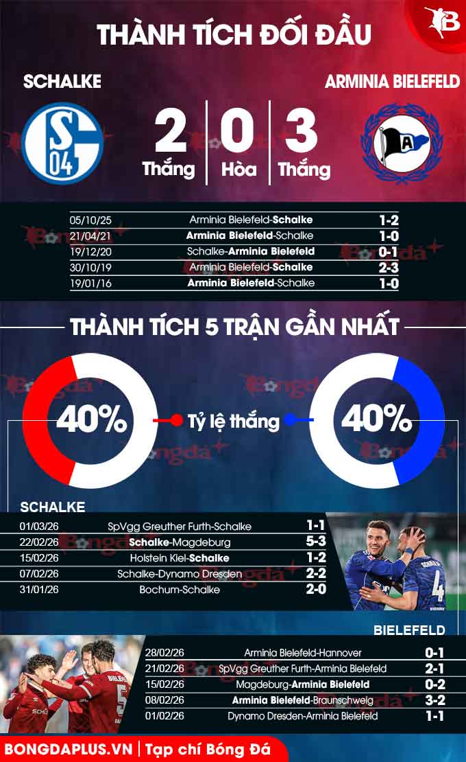 Vì thế, nhiều khả năng Schalke sẽ giành trọn vẹn 3 điểm trước một Bielefeld đã thua họ 4/6 trận gần nhất tại Veltins-Arena, để củng cố ngôi đầu BXH Bundesliga 2 mùa 2025/26.