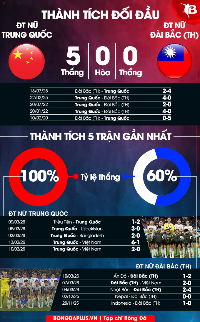 Bongdaplus dự đoán kết quả ĐT nữ Trung Quốc vs ĐT nữ Đài Bắc Trung Hoa