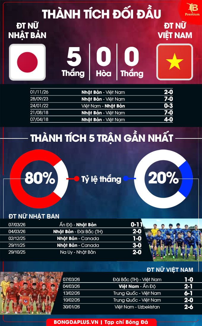 Nhật Bản được xem là đội bóng mạnh nhất của bảng C, thậm chí họ là ứng viên sáng giá của cuộc đua vô địch. Đơn cử, Nhật Bản vừa có 2 trận thắng liên tiếp trước Đài Bắc Trung Hoa và Ấn Độ, đặc biệt là trận gặp Ấn Độ mới đây họ đã dội mưa bàn thắng với tỷ số 11-0, khiến các đối thủ phải choáng váng. Vì thế ở trận đấu với ĐT nữ Việt Nam, mục tiêu của các cô gái bóng đá xứ Phù Tang là phải giành trọn 3 điểm để đứng đầu bảng C với 3 trận toàn thắng.