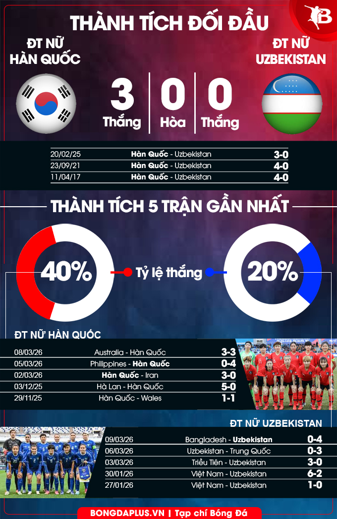 Phân tích phong độ ĐT nữ Hàn Quốc vs ĐT nữ Uzbekistan