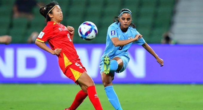 Vũ Thị Hoa không thắng được hậu vệ Ấn Độ trong một pha bứt tốc để thực hiện pha phản công.