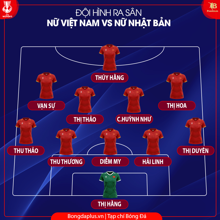 HLV Mai Đức Chung đã thay đổi mạnh mẽ ở đội hình xuất phát của ĐT nữ Việt Nam so với trận thua Đài Bắc Trung Hoa. Theo đó, vị chiếc lược gia này đã sử dụng 5 cầu thủ mới gồm thủ môn Khổng Thị Hằng, trung vệ Hải Linh, Thu Thương, tiền vệ Vũ Thị Hoa và tiền đạo Thúy Hằng. Những gương mặt kỳ cựu như Bích Thùy, Thanh Nhã, Huỳnh Như, Hải Yến… xuất phát ở ghế dự bị.