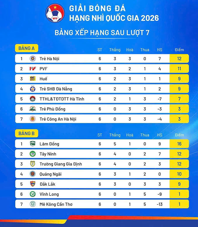 Ở bảng B, Lâm Đồng tiếp tục thể hiện phong độ ấn tượng khi đánh bại Mê Kông Cần Thơ 3-0, qua đó giữ vững ngôi đầu sau lượt đi với 16 điểm. Đây là lợi thế quan trọng cho đội bóng này trong cuộc đua giành vé lên hạng. Ở các trận đấu khác, Đắk Lắk vượt qua Tây Ninh với tỷ số 1-0, còn Trường Giang Gia Định thắng đậm Quảng Ngãi 3-0. Kết quả này giúp Trường Giang Gia Định tiếp tục bám sát nhóm dẫn đầu sau 6 trận, tạo thêm sức nóng cho cuộc cạnh tranh ở bảng B.