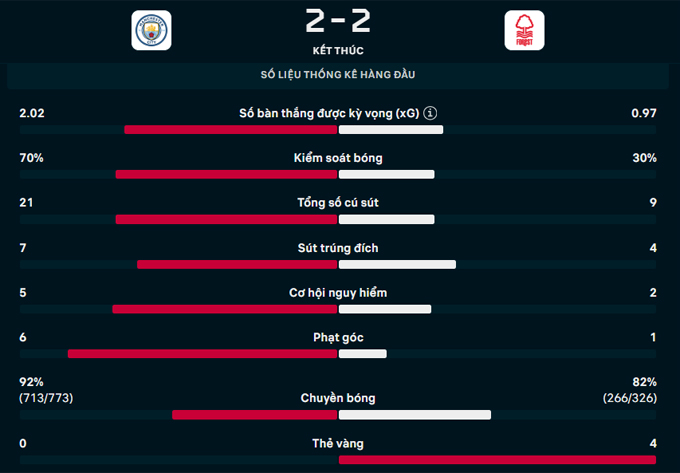 Tưởng chừng chiến thắng đã nằm chắc trong tay nhà đương kim vô địch, thì kịch tính lại nổ ra ở giai đoạn cuối trận. Elliot Anderson trở thành người hùng của Nottingham với cú sút xa "cháy lưới" Donnarumma. Hòa 2-2 trong tiếc nuối, Man City bị Arsenal bỏ cách 7 điểm (60 so với 67) và không có quyền tự quyết trong cuộc đua tới chức vô địch Ngoại hạng Anh mùa này.