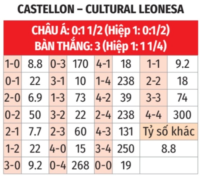 - Tối thiểu 3 bàn thắng: 3 trận gần đây của Castellon đều kết thúc với tối thiểu 3 bàn thắng. 9/11 trận sân khách vừa qua của Cutural Leonesa tương tự.