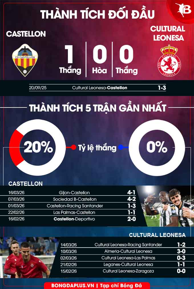 Đặc biệt, Cultural Leonesa rất yếu bóng vía trên sân khách. Theo thống kê, họ không thắng ở 7/9 chuyến hành quân trở lại đây trong khuôn khổ giải hạng Nhì Tây Ban Nha. Với một đối thủ yếu bóng vía, lại đang lẹt đẹt ở áp chót bảng xếp hạng như Cultural Leonesa, Castellon có hy vọng giành 3 điểm.