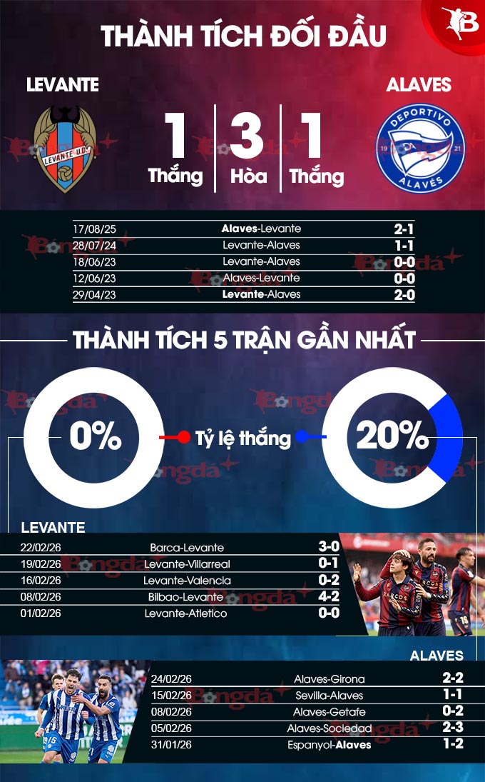 Cần phải nhấn mạnh rằng, Alaves ở trận này còn có sự ủng hộ của lịch sử. Bằng chứng là trong 11 lần chạm trán giữa hai đội gần đây ở La Liga, họ 7 lần đánh bại Levante, còn lại hòa 2 trận và chỉ phải nhận 2 thất bại. Do vậy, Alaves hoàn toàn có khả năng gieo sầu cho đội chủ nhà ở trận đấu cuối tuần này.