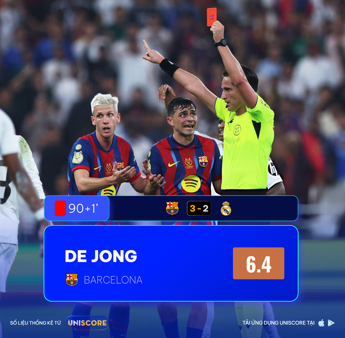 El Clásico tại Ả Rập là một trận đấu giàu va chạm. Barcelona phạm 18 lỗi, Real Madrid 12 lỗi, tổng cộng 30 pha phạm lỗi - con số phản ánh mức độ quyết liệt của trận chung kết. 5 thẻ vàng và 1 thẻ đỏ của đội trưởng Barca, Frenkie de Jong cho thấy ranh giới giữa kiểm soát cảm xúc và mất kiểm soát trong những trận cầu lớn mong manh đến mức nào. Đây không chỉ là cuộc đấu chiến thuật, mà còn là cuộc chiến về tâm lý.