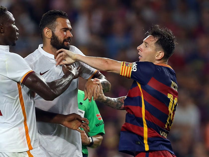 Một hành động hoàn toàn ngoài tính cách của Messi. Trong trận giao hữu gặp AS Roma năm 2015, anh bị phạt thẻ vàng vì phản ứng lại với Mapou Yanga-Mbiwa. Sau khi bị đối thủ húc đầu khiêu khích, Messi mất bình tĩnh, đáp trả bằng cú húc và thậm chí còn bóp cổ Mapou.