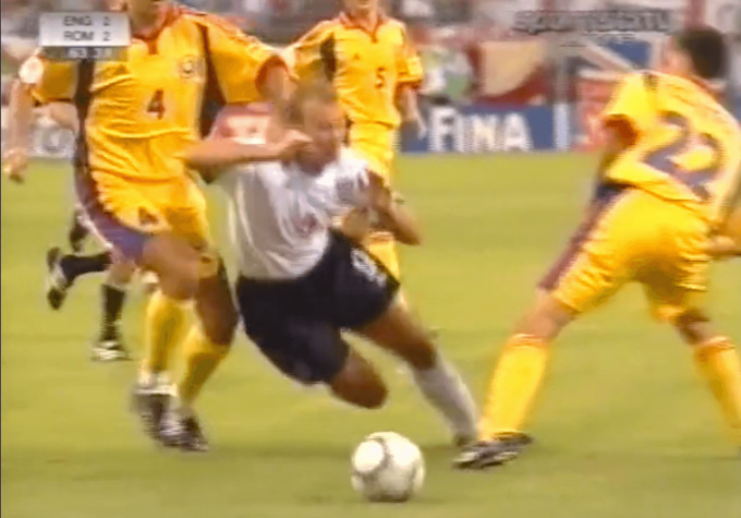Trong thế trận bế tắc ấy, Shearer nhận bóng cách khung thành khoảng 30 mét. Ông xoay người xử lý không tệ, nhưng chỉ vài nhịp sau đã bị hai hậu vệ Romania vây lại. Một cú chạm bóng lỗi khiến bóng đi quá xa khỏi tầm kiểm soát. Rồi Shearer ngã xuống.