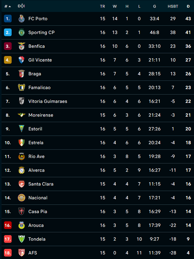 Sau 16 vòng, Benfica đứng thứ ba với 36 điểm, kém đội đầu bảng Porto tới 7 điểm. Nếu Porto thắng AVS vào rạng sáng 30/12, họ có thể tạo khoảng cách lên tới 10 điểm với Benfica.