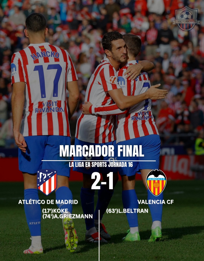 Đánh bại Valencia với tỷ số 2-1, Atletico chấm dứt được chuỗi 2 thất bại liên tiếp tại La Liga đồng thời vẫn duy trì được vị trí trong top 4.