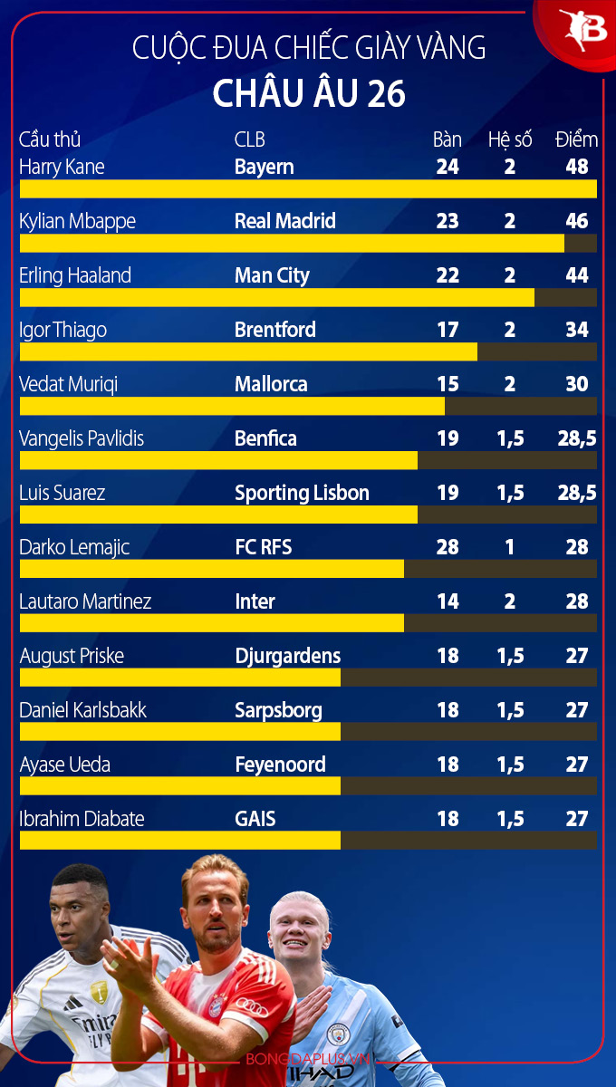 Với cú đúp trong trận Bayern Munich hủy diệt Hoffenheim 5-1 ở vòng 21 Bundesliga, Kane đã nâng tổng số bàn thắng tại Bundesliga 2025/26 lên con số 24. Như vậy, Kane ngoài việc dẫn dầu danh sách Vua phá lưới giải đấu trên, anh còn đứng số 1 ở cuộc đua Chiếc giày Vàng châu Âu khi có 48 điểm (Bundesliga, Ligue 1, Ngoại hạng Anh, Serie A và La Liga nhân hệ số 2).