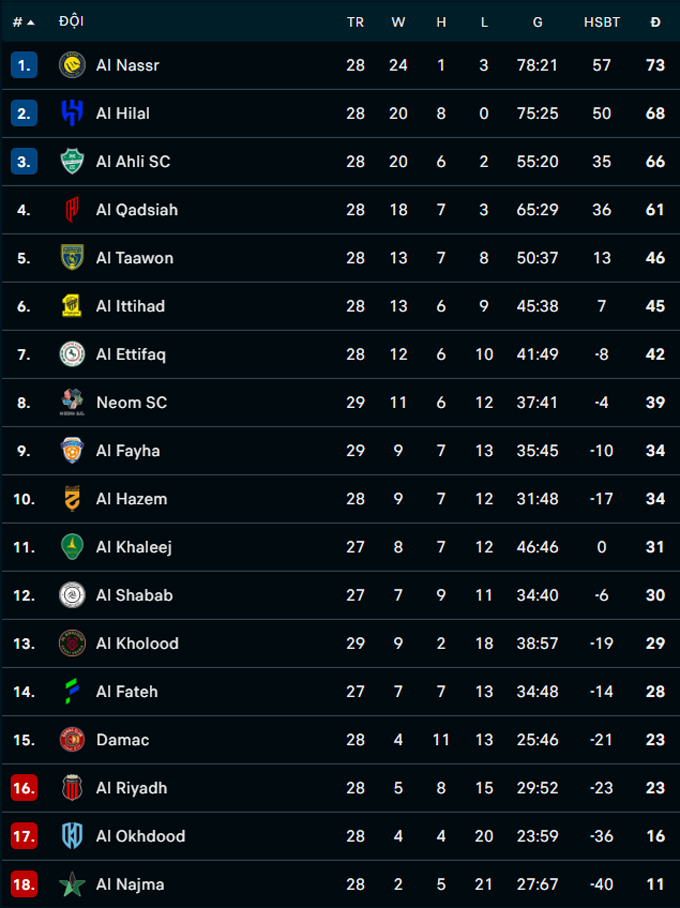 Trên bảng xếp hạng Saudi Pro League, Al Nassr đang dẫn đầu, còn Al Akhdoud đứng áp chót. Điều này đồng nghĩa với việc Al Akhdoud nếu không nhanh chóng cải thiện vị trí, họ sẽ phải xuống hạng.