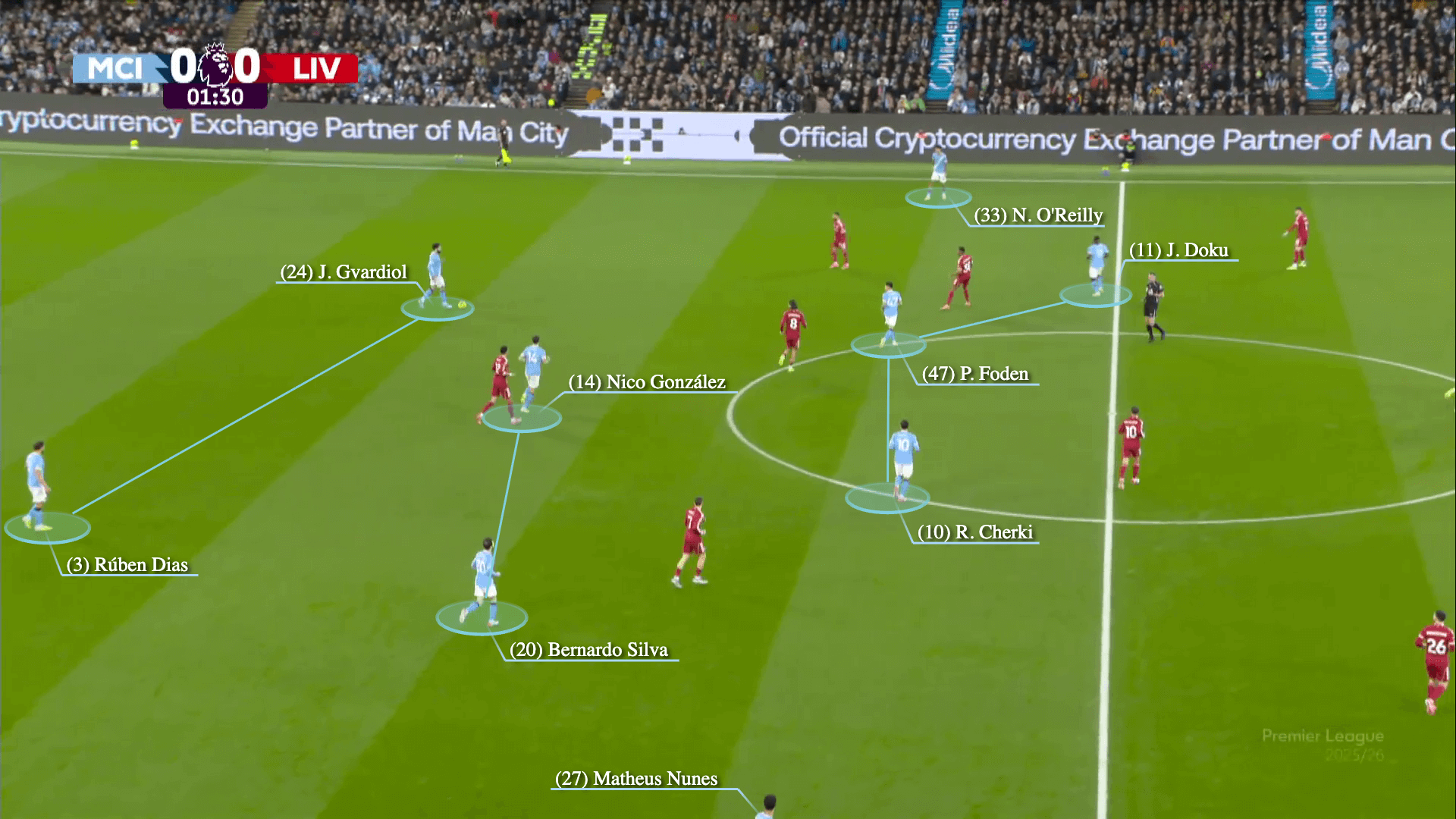 Gặp Liverpool, như Michael Cox của The Athletic phân tích, Guardiola sử dụng Jeremy Doku ở các khu vực trung lộ, ưu tiên tăng quân số ở giữa sân, trong khi các hậu vệ biên Nico O’Reilly và Matheus Nunes giữ chiều rộng đội hình.