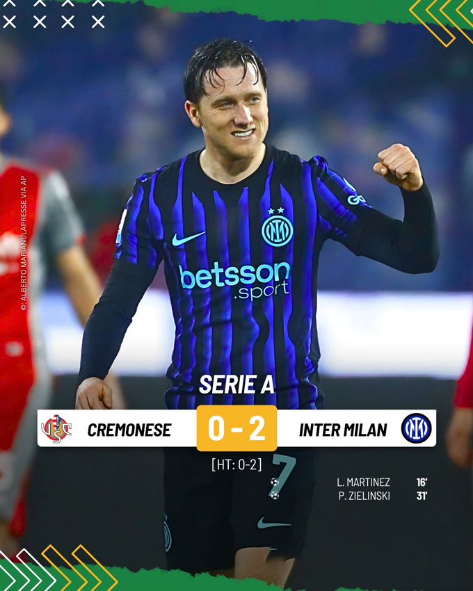 Chuyển sang vòng 23 Serie A, Inter Milan đã có chiến thắng 2-0 ngay trên sân của Cremonese. Những người lập công cho Nerazzurri là Lautaro Martinez (phút 16) và Piotr Zielinski (phút 31).