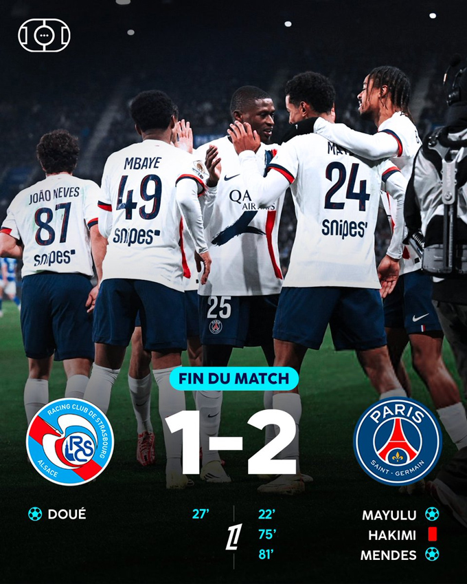 Tại vòng 20 Ligue 1, PSG hành quân tới sân của đối thủ khó chịu Strasbourg. Đội khách có bàn mở tỷ số ở phút 22 nhờ công của Mayulu. Dù vậy, niềm vui của PSG chỉ kéo dài 5 phút, trước khi Guela Doue gỡ hòa cho đội chủ nhà.