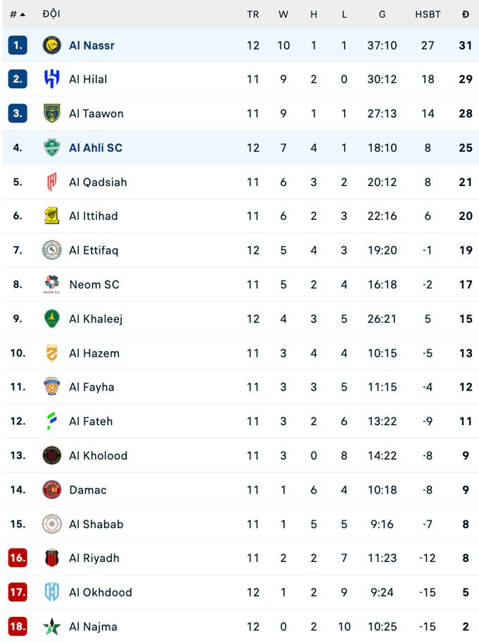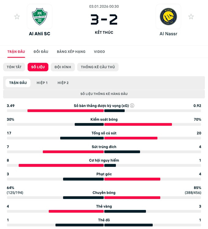 Chung cuộc, Al Nassr (31 điểm/12 trận) chính thức nhận thất bại đầu tiên ở mùa giải này với tỷ số 2-3. Không chỉ vậy, họ còn đối diện nguy cơ mất vị trí đầu bảng Saudi Pro League vào tay Al Hilal (29 điểm/11 trận), thậm chí có thể bị đội xếp thứ 3 Al Taawoun đuổi kịp (28 điểm/11 trận).