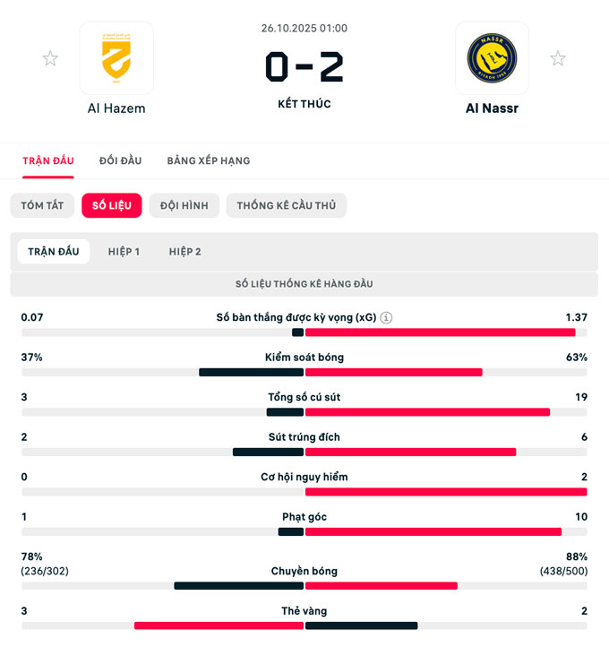 Với chiến thắng này, Al Nassr tiếp tục dẫn đầu bảng xếp hạng với thành tích toàn thắng, ghi ít nhất hai bàn trong mỗi trận và bất bại 6 lần đối đầu gần nhất với Al Hazm (thắng 5, hòa 1).