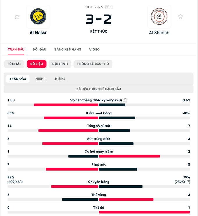 Kết quả cuối cùng của trận đấu là 3-2 nghiêng về phía Al Nassr. Chiến thắng này giúp Al Nassr thu hẹp cách biệt với đội đầu bảng Al Hilal xuống còn 4 điểm nhưng đang đá nhiều hơn 1 trận.