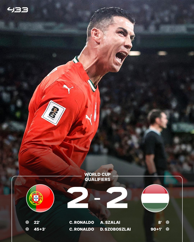 Ở trận gặp Hungary tại bảng F vòng loại World Cup 2026 khu vực châu Âu, Bồ Đào Nha chỉ thu về kết quả 2-2 dù siêu sao Cristiano Ronaldo rực sáng với cú đúp bàn thắng.