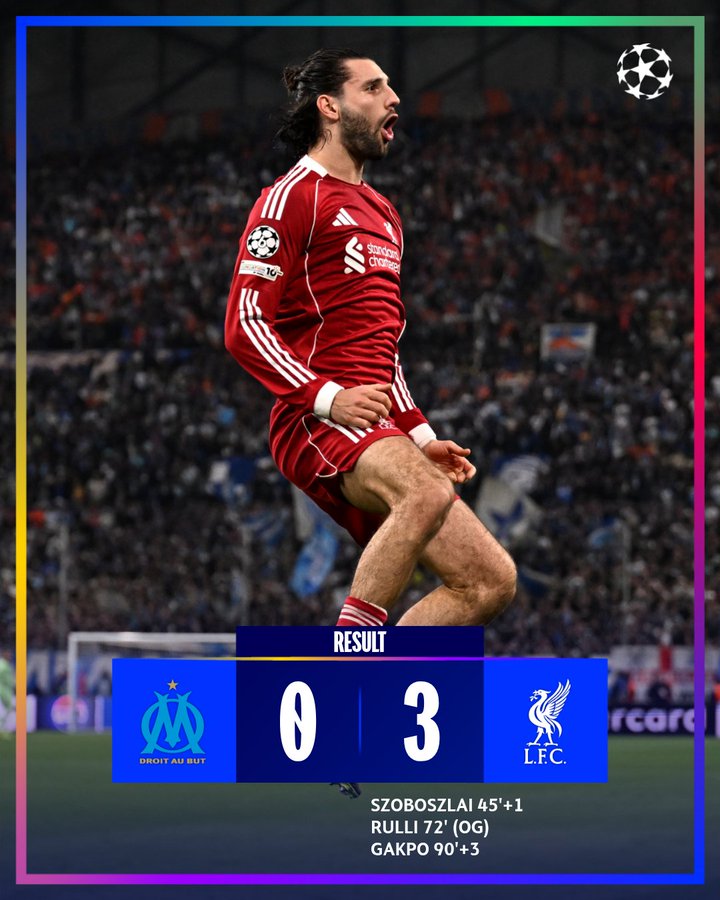 Liverpool phô diễn sức mạnh tại Velodrome khi đè bẹp chủ nhà Marseille 3-0, qua đó tiến rất gần suất vào thẳng vòng 1/8 Champions League và khẳng định vị thế thứ 4 trên BXH.