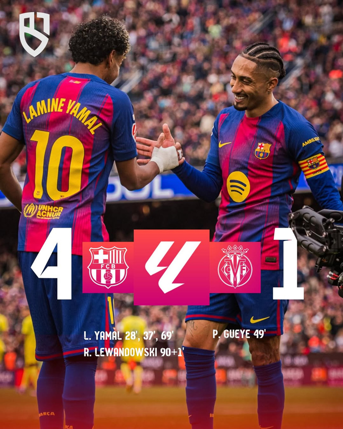 Tại vòng 26 La Liga, Barca có chiến thắng tưng bừng 4-1 trên sân nhà trước Villarreal với một cú hat-trick của Lamine Yamal. Vallecano hòa Bilbao 1-1, Sociedad thắng Mallorca 1-0 còn Atletico cũng đánh bại Real Oviedo với tỷ số tương tự.