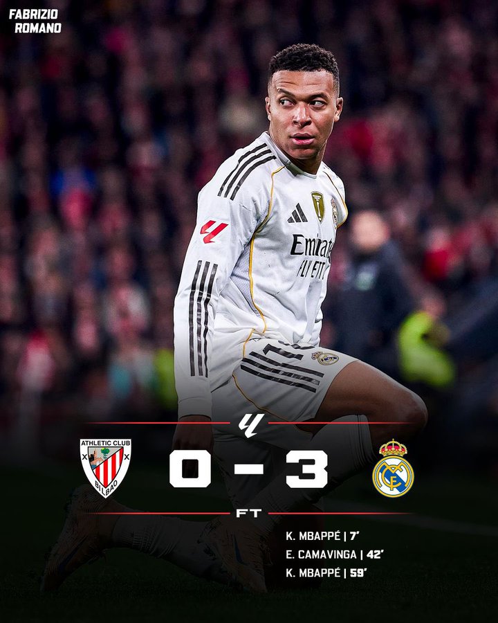 Tại La Liga, Real Madrid giải tỏa áp lực đúng lúc với chiến thắng 3-0 trên sân của Athletic Bilbao, nơi Kylian Mbappe tiếp tục là ngôi sao không thể cản. Với cú đúp vào lưới Bilbao, tiền đạo Kylian Mbappe đã lập thêm hàng loạt kỷ lục ấn tượng sánh ngang với thần tượng Cristiano Ronaldo.