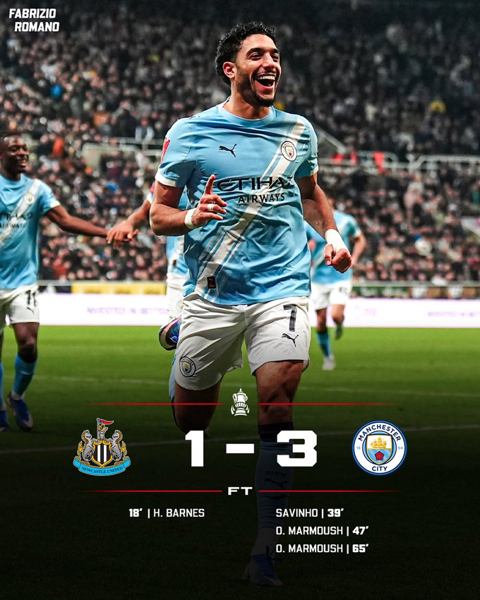 Ở trận đấu giữa Newcastle vs Man City tại FA Cup 2025/26, đội khách dù không tung ra đội hình tối ưu nhưng nhờ sự tỏa sáng của chân sút Marmoush, họ đã đánh bại đối thủ 3-1 để giành vé đi tiếp.