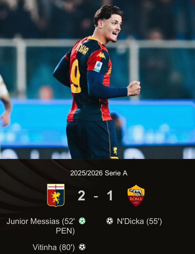 Roma đã nhận thất bại cay đắng 1-2 trên sân của Genoa ở vòng 28 Serie A, trong trận đấu mà HLV Daniele De Rossi đã dẫn dắt Genoa đánh bại chính đội bóng cũ. Kết quả này khiến Roma đánh mất lợi thế trong cuộc đua top 4, đồng thời tạo cơ hội để Como bắt kịp họ về điểm số.