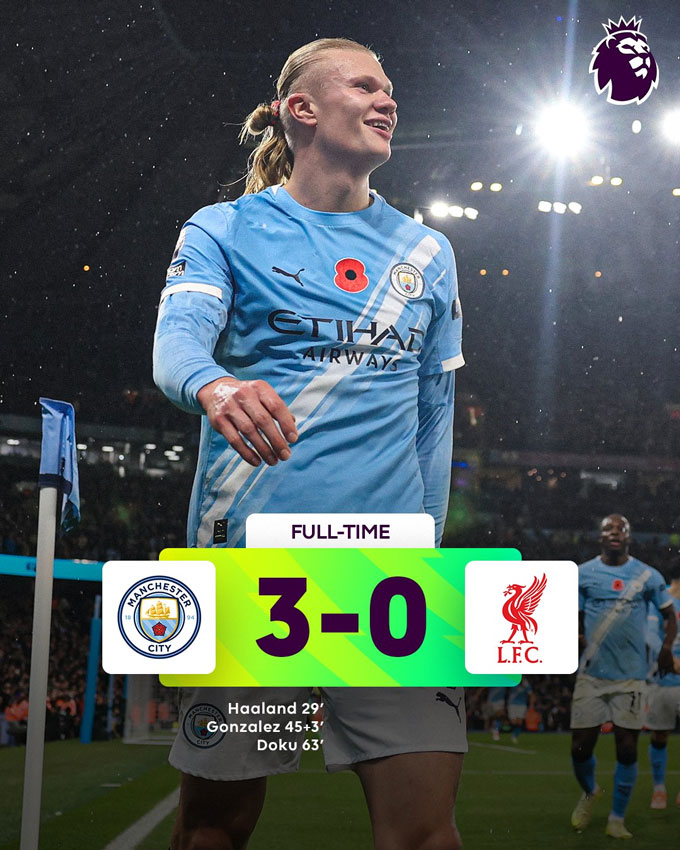 Tại vòng 11 Premier League, Man City đã huỷ diệt Liverpool với tỷ số 3-0 trên sân nhà để trở lại vị trí thứ 2 trên BXH. Trong khi đó, Liverpool tụt xuống vị trí thứ 8, dưới cả Man United. Các bàn thắng của Man xanh được ghi do công của Haaland (29'), Nico (45'+3) và Doku (63'). Đây cũng là quà mừng đáng nhớ cho trận đấu thứ 1000 trên băng ghế huấn luyện của HLV Pep Guardiola.