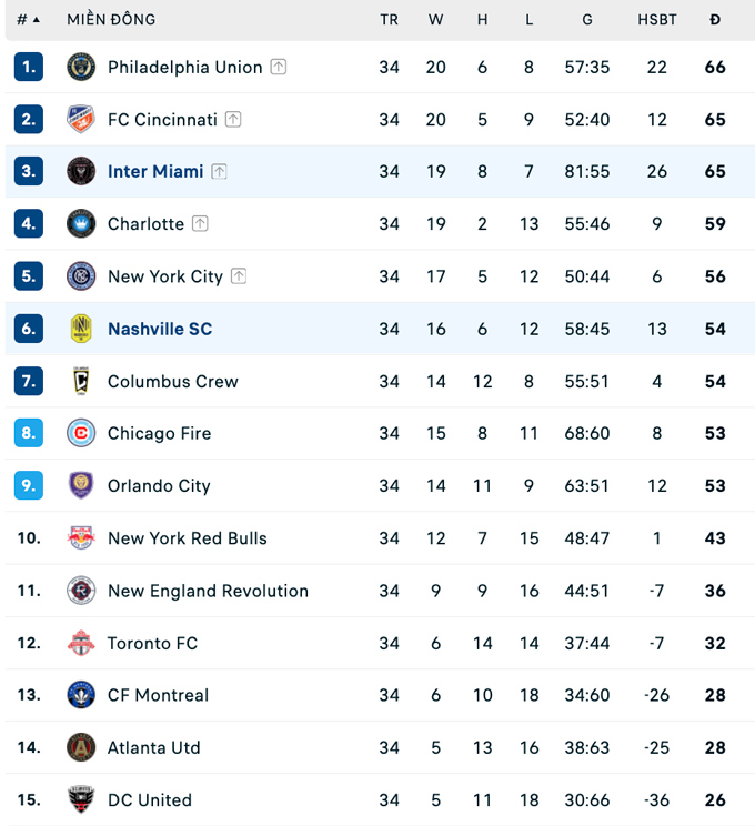 Inter Miami kết thúc mùa giải Regular season MLS 2025 với vị trí thứ 5 tại BXH miền Đông. Họ bằng điểm Cincinnati nhưng kém hơn về chỉ số phụ. Philadelphia Union giành ngôi vô địch. Miami cũng giành vé dự MLS Cup 2025.