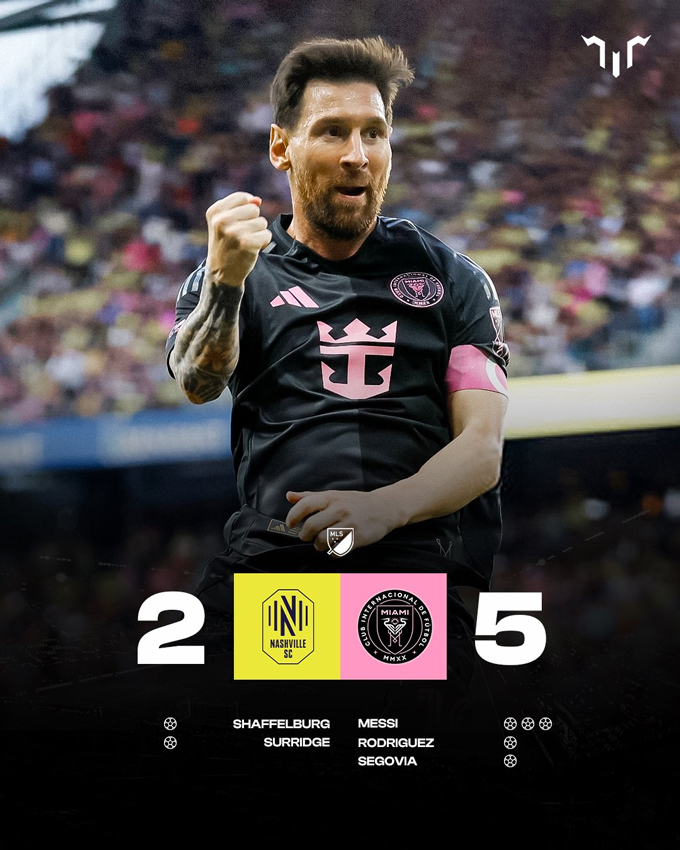 Chỉ 5 phút sau, Baltasar Rodríguez tiếp tục tỏa sáng với pha dứt điểm cận thành, đưa Inter Miami vượt lên dẫn 3-2. Đến phút 81, Messi hoàn tất cú hat-trick của mình bằng pha cứa lòng hiểm hóc vào góc dưới bên trái. Ở những phút bù giờ, siêu sao người Argentina tiếp tục để lại dấu khi có đường kiến tạo để Telasco Segovia ấn định chiến thắng 5-2 cho Inter Miami.