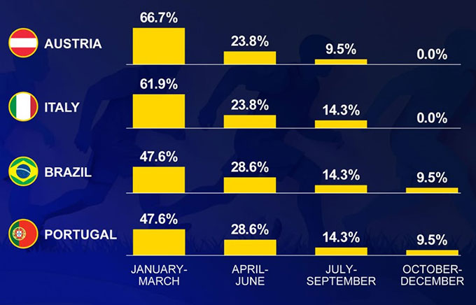 Tỷ lệ cầu thủ sinh theo tháng của 4 đội vào bán kết U17 World Cup 2025