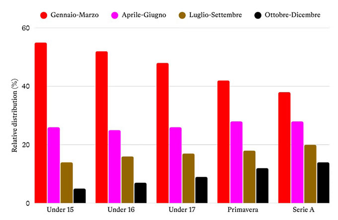 Các nghiên cứu khoa học, như công trình năm 2018 về RAE trong bóng đá Italia, cho thấy sự mất cân bằng rõ rệt ngay từ cấp độ U15. Tỷ lệ cầu thủ sinh trong quý đầu năm (tháng 1-3) luôn vượt trội so với nhóm cuối năm.