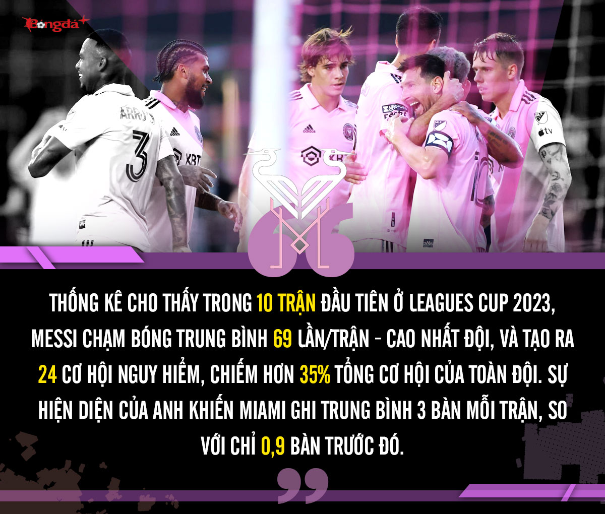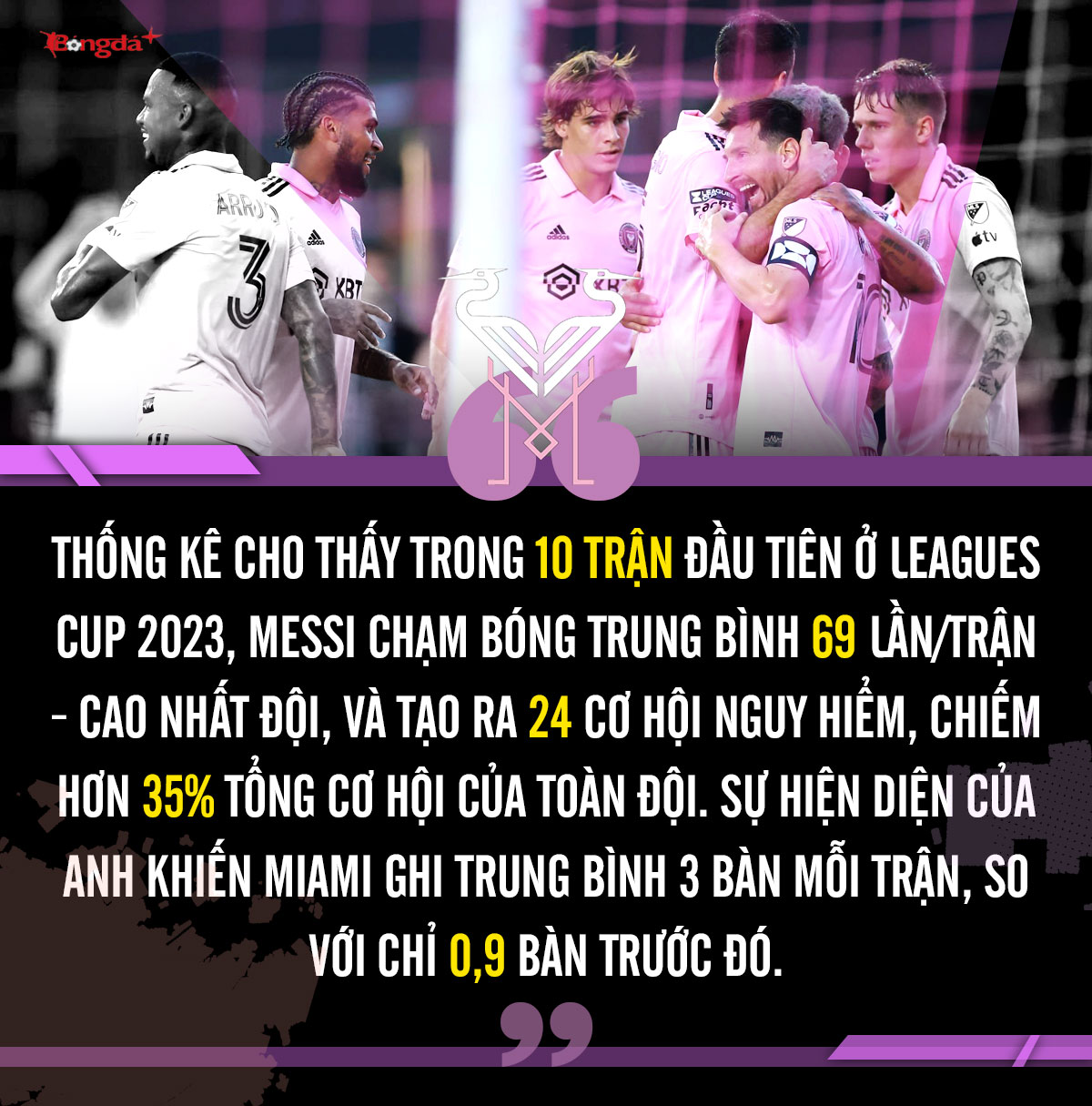 Thống kê cho thấy trong 10 trận đầu tiên ở Leagues Cup 2023, Messi chạm bóng trung bình 69 lần/trận – cao nhất đội, và tạo ra 24 cơ hội nguy hiểm, chiếm hơn 35% tổng cơ hội của toàn đội. Sự hiện diện của anh khiến Miami ghi trung bình 3 bàn mỗi trận, so với chỉ 0,9 bàn trước đó.