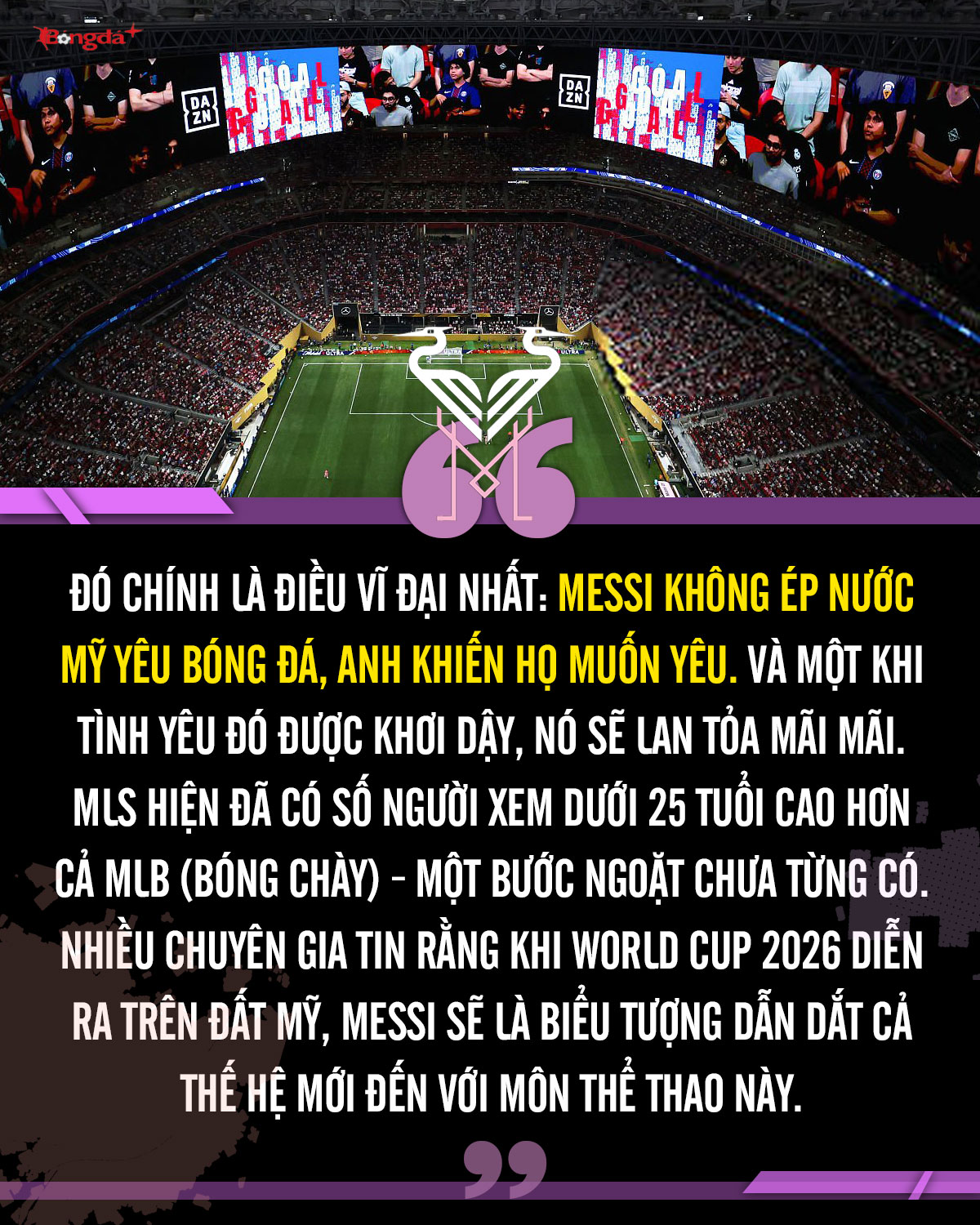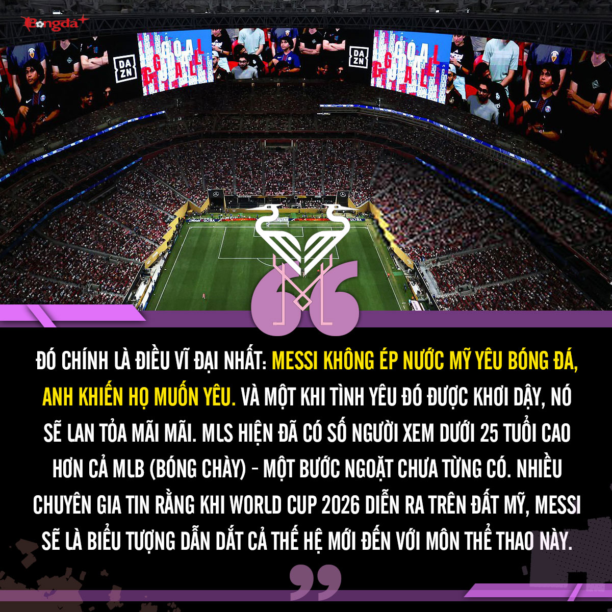 Đó chính là điều vĩ đại nhất: Messi không ép nước Mỹ yêu bóng đá, anh khiến họ muốn yêu. Và một khi tình yêu đó được khơi dậy, nó sẽ lan tỏa mãi mãi. MLS hiện đã có số người xem dưới 25 tuổi cao hơn cả MLB (bóng chày) – một bước ngoặt chưa từng có. Nhiều chuyên gia tin rằng khi World Cup 2026 diễn ra trên đất Mỹ, Messi sẽ là biểu tượng dẫn dắt cả thế hệ mới đến với môn thể thao này.