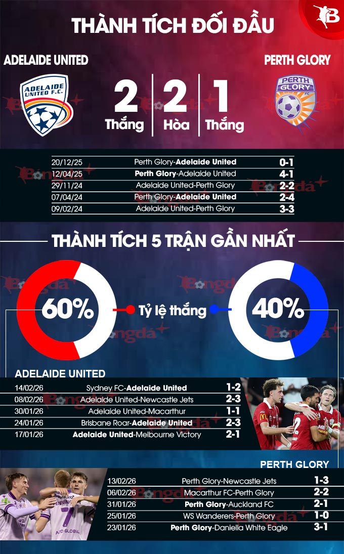 Bên cạnh đó, 10 lần so tài gần đây, Adelaide United thắng 6, hòa 3 và thua 1 trước Perth Glory. Chưa hết, 6 lần gần nhất tiếp Perth Glory trên sân nhà, Adelaide United thắng 3, hòa 2 và thua 1 trước đối thủ. Với những gì đang thể hiện, Adelaide United nhiều khả năng sẽ có 3 điểm trên sân nhà.