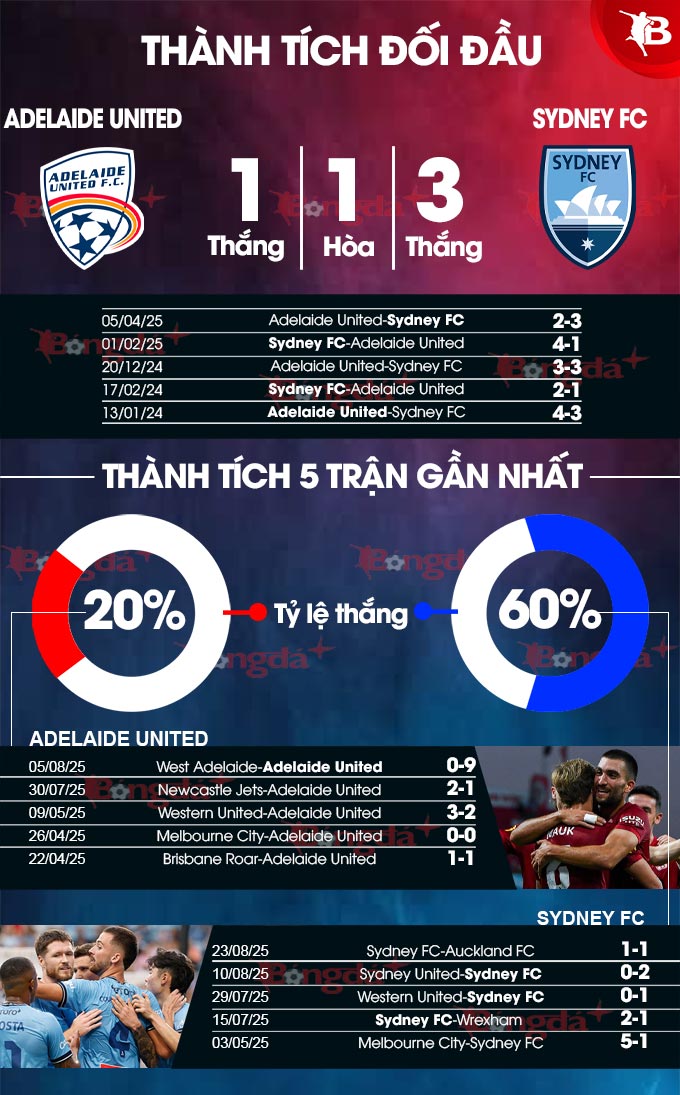 Về phần mình, Sydney FC lại bất bại 4 trận vừa qua trên mọi đấu trường, bao gồm 1 trận hòa và 3 chiến thắng. Trên sân đối phương, Sydney FC cũng toàn thắng ở cả 2 trận gần đây và đang hướng tới sự khởi đầu mùa giải mới bằng việc giành 3 điểm tại tổ ấm của Adelaide United.
