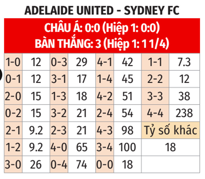 - Từ 4 bàn trở lên: Cả 4 cuộc đối đầu gần nhất, 7/10 trận gần đây của Adelaide United và 8/11 trận sân nhà vừa qua của Adelaide United cũng khép lại với từ 4 bàn trở lên. Trận này khó có ngoại lệ.
