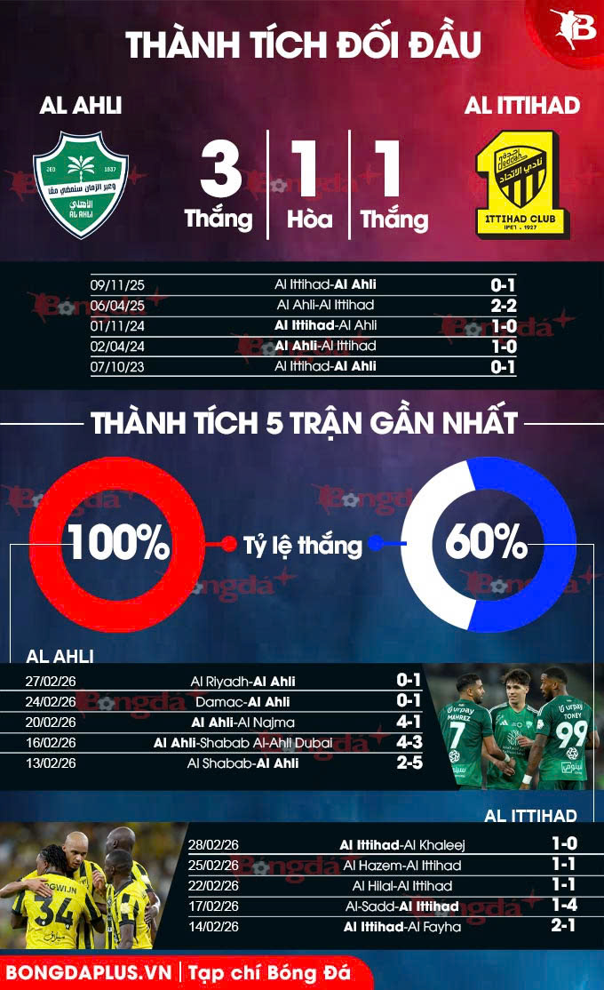 - Tối đa 1 bàn hiệp 1: 3 trận liên tiếp gần đây của Al Ahli cùng 4/5 trận vừa qua của Al Ittihad đều có nhiều nhất 1 bàn thắng trong 45 phút đầu tiên. 5 trận đối đầu gần nhất cũng có không quá 1 bàn trước giờ nghỉ, với 2 trận gần đây thậm chí hòa không bàn thắng.