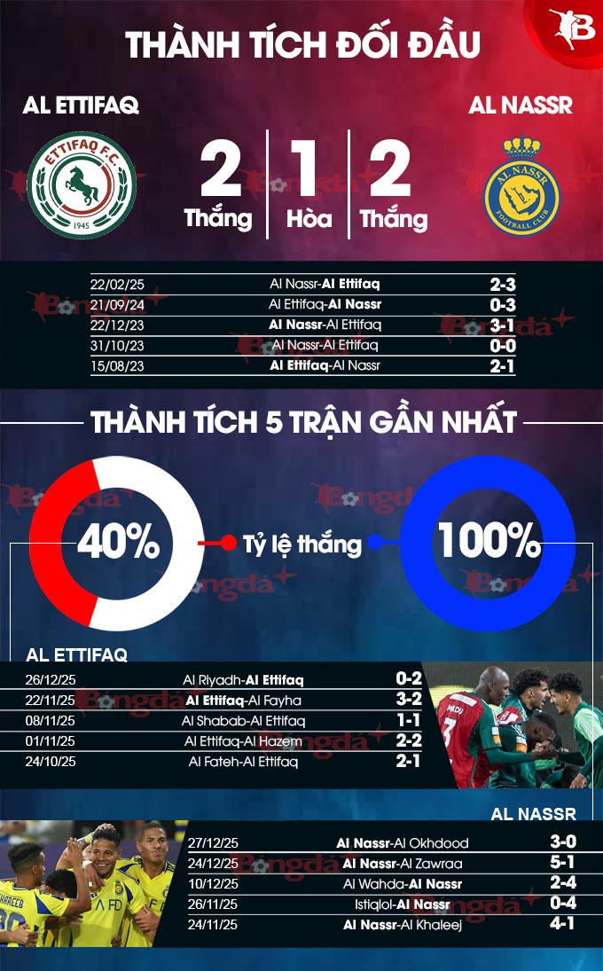 - Ít nhất 2 bàn hiệp 1: 5 trận liên tiếp gần đây của Al Nassr cùng 6/8 trận sân nhà vừa qua của Al-Ettifaq đều xuất hiện ít nhất 2 bàn thắng trong 45 phút đầu. Kịch bản bùng nổ bàn thắng sớm khả năng sẽ xuất hiện.