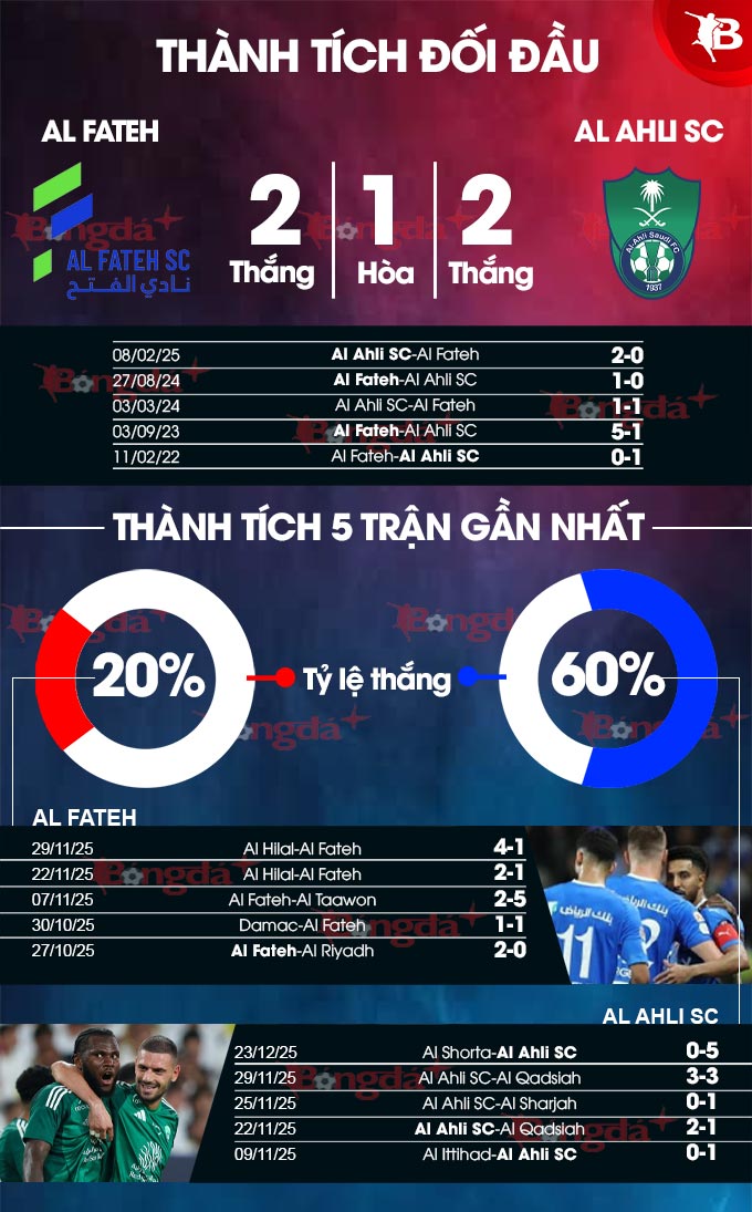 - Nhiều bàn thắng: 4/5 trận gần đây của Al-Fateh cùng 3 trận vừa qua của Al Ahli trên mọi đấu trường đều có ít nhất 3 bàn thắng được ghi. 4 trận đối đầu gần nhất trên sân nhà của Al-Fateh đã xuất hiện tới 17 bàn thắng, bình quân gần 4 bàn/trận.
