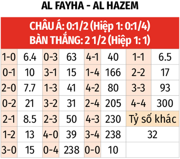 - Lẻ bàn thắng: 3/4 trận gần đây của Al-Fayha cùng 2 trận liên tiếp của Al-Hazem đều có tổng bàn thắng là lẻ. 4/6 trận vừa qua của Al-Hazem cũng xuất hiện tổng bàn thắng là lẻ.